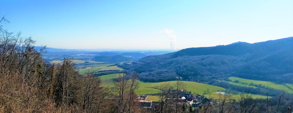 Nádherný výhled z unikátní stolové hory. Vyhlídka ve výšce 524 metrů nad mořem. Výhled nabízí pohled na obec Perštejn a na Doupovské hory.